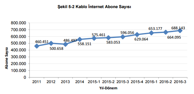 Kablo internet abone sayısının seyri Şekil 5-2de gösterilmekte olup önceki üç aylık döneme göre yaklaşık %3,6 artış gösteren kablo internet abone sayısı 688.143e yükselmiştir